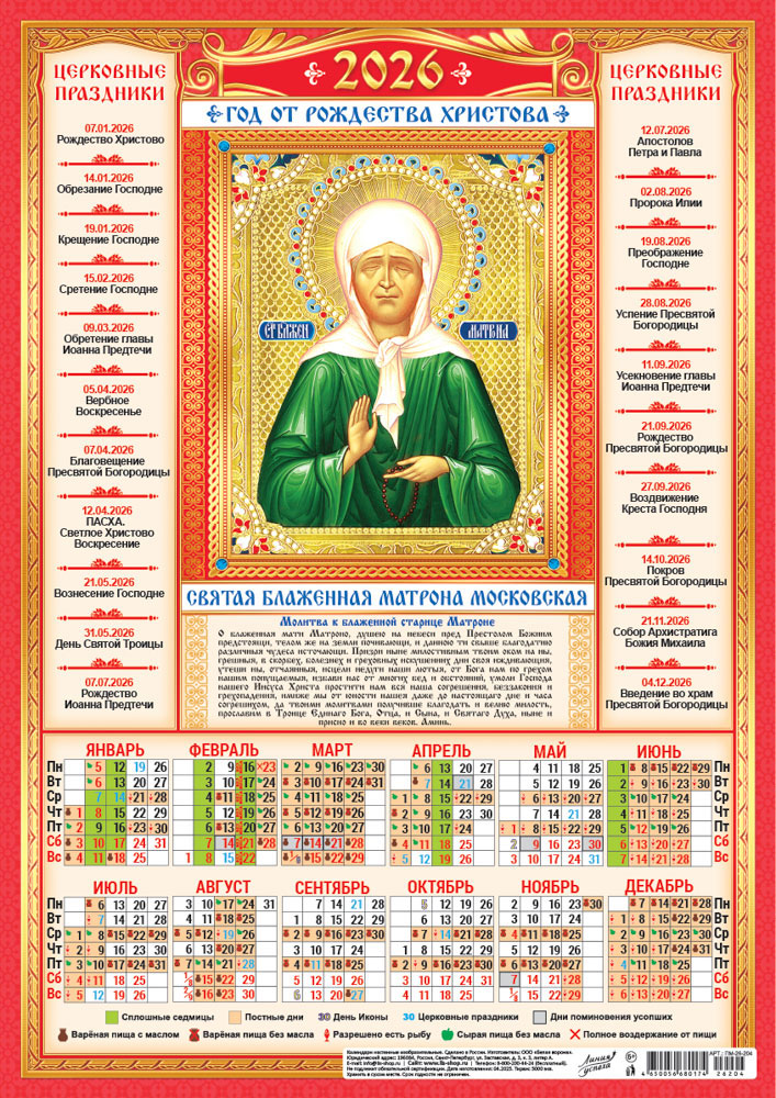 Календарь - плакат А3 2026 Икона Матрона Московская