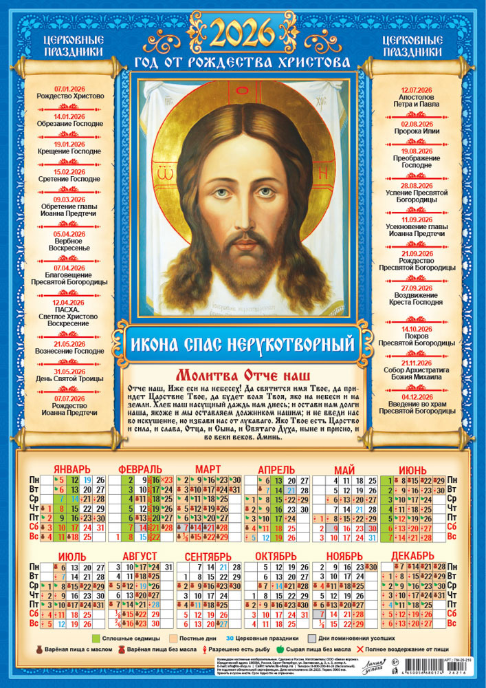 Календарь - плакат А3 2026 Икона. Спас Нерукотворный