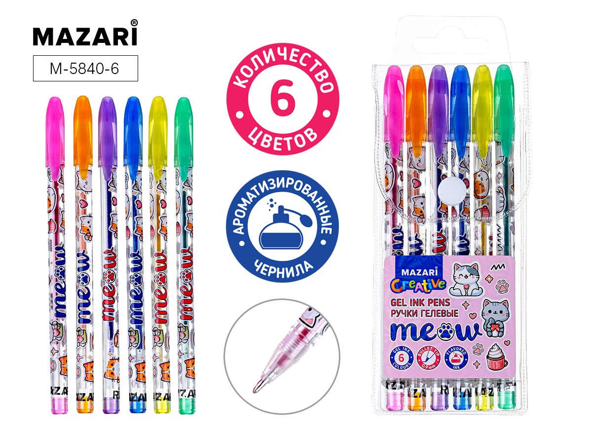 Ручки гел. в наборе с блест. Mazari Meow 6цв