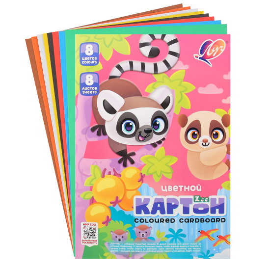 Цвет.картон А4 Луч 8л 8цв "Zoo" Лемуры